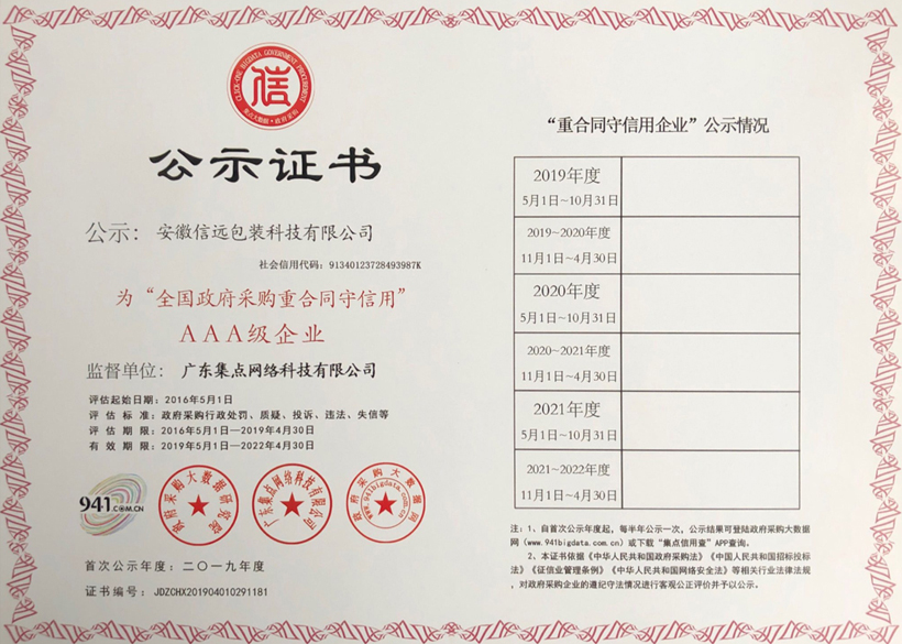 政府采購大數(shù)據(jù)研究院根據(jù)全國政府采購誠信記錄,對法理依據(jù)、地方執(zhí)法裁量權(quán)等多個方面進行科學(xué)的整理歸納后,將全國政府采購信用行為歸納為為22個類別。通過對供應(yīng)商安徽信遠(yuǎn)包裝科技有限公司14種行為信用數(shù)據(jù)進行綜合評估,授予信遠(yuǎn)科技為“全國政府采購重合同守信用AAA級榮譽”.