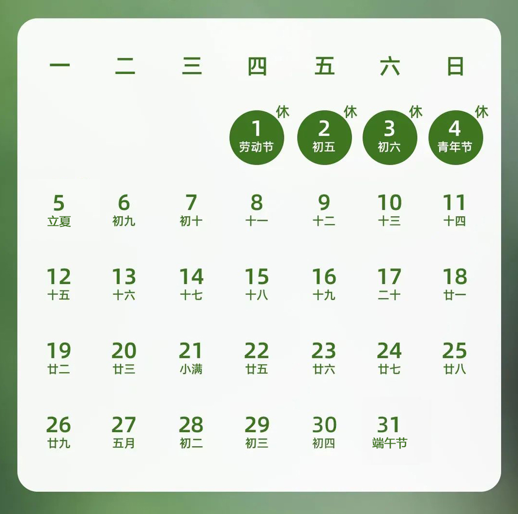 “五一”小長假開啟在即,根據(jù)國家節(jié)假日放假通知安排,信遠(yuǎn)公司結(jié)合實(shí)際情況,決定5月1日(周四)—4日(周日)放假,共4天?!拔逡还?jié)”是探親游玩的出行高峰,信遠(yuǎn)公司溫馨提示廣大新老客戶朋友、公司員工,如計(jì)劃外出,請?zhí)崆昂侠硪?guī)劃出行路線,自駕需提前檢查車況,避免疲勞駕駛,安全出行,平安回家,讓我們共同度過一個(gè)歡樂祥和的節(jié)日。